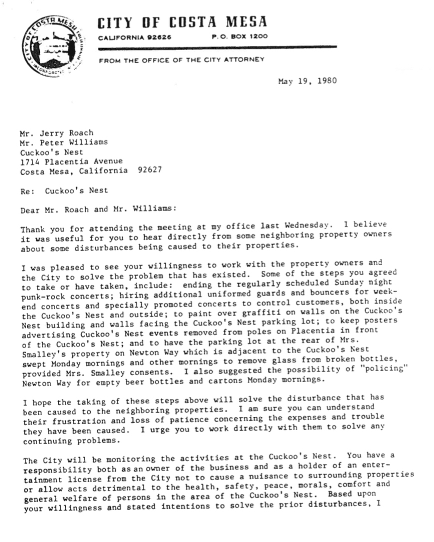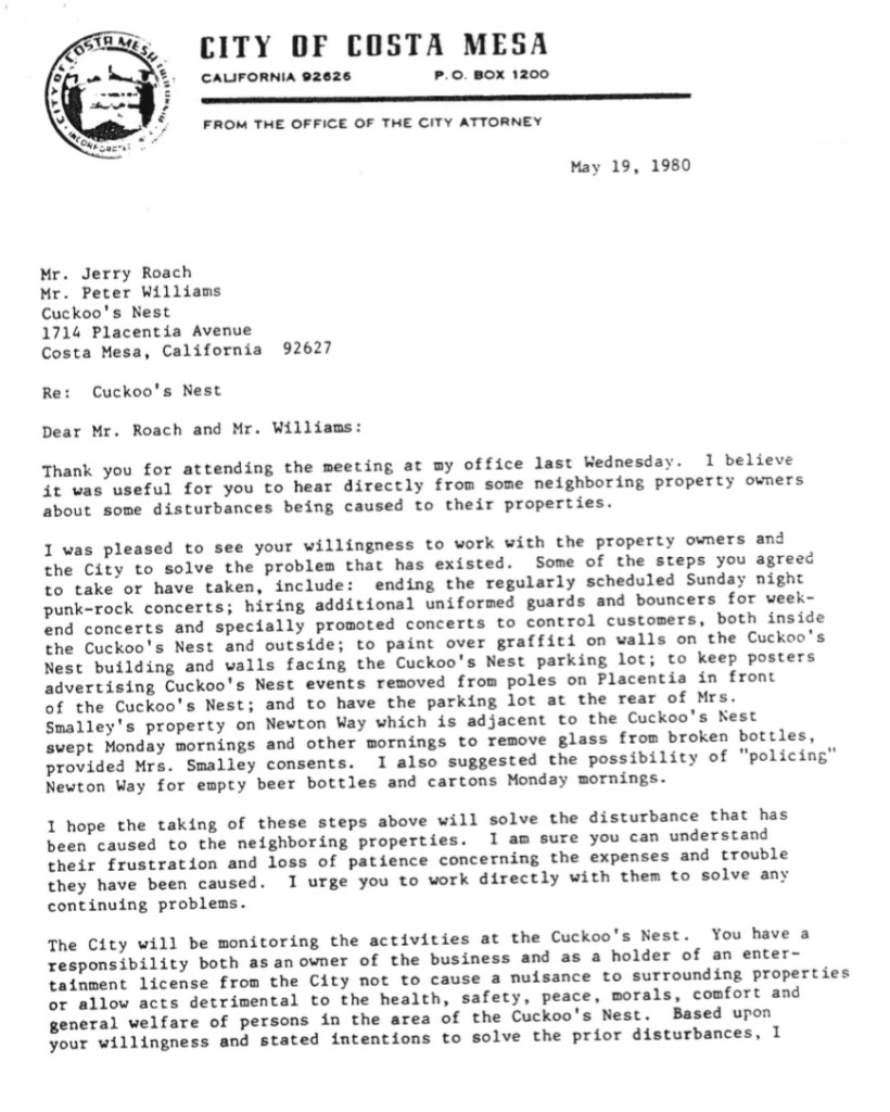 Next Image may-19-1980-city-attorney-letter-part-1 May 19, 1980 Letter from City Attorney to Cuckoo’s Nest, page 1