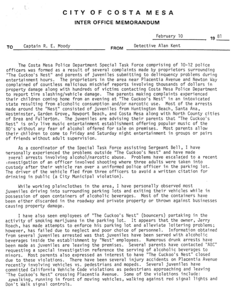 a history of the attack on the Cuckoo's Nest by the Costa Mesa business community, police, and City bureaucracy
