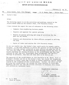 a history of the attack on the Cuckoo's Nest by the Costa Mesa business community, police, and City bureaucracy
